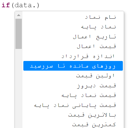 برای شروع یک فیلتر ساده را می خواهیم بنویسیم تا تمام قراردادهایی که کمتر از 20 روز به قیمت اعمال آن ها باقی مانده را به ما نشان دهد. با رفتن به بخش ساخت فیلتر و انتخاب گزینه ساخت فیلتر جدید می توانیم فیلتر مورد نظر خود را بنویسیم. برای شروع یک شرط باید بنویسید تا قراردادهایی که روزهای باقیمانده تا سررسید آن ها کمتر از 20 باشد را پیدا کنید. با نوشتن کلمه data. بلافاصله مطابق شکل مقابل پنجره ای باز می شود که تمام پارامترها را به شما نشان می دهد و می توانید مقدار مورد نظر را از بین آن ها انتخاب کنید.